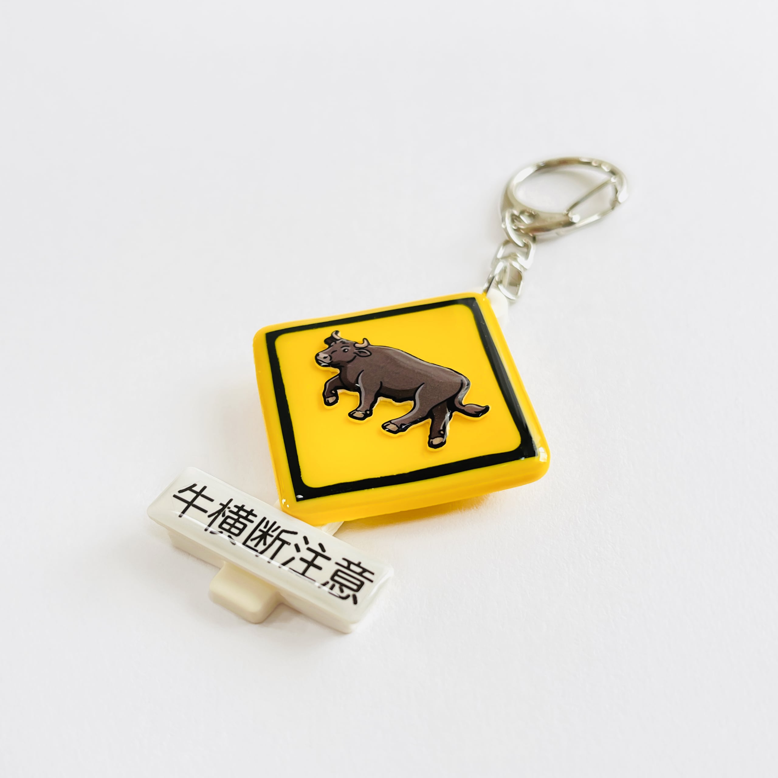鮮やかな黄色が目を引く《牛横断注意》の標識キーホルダー。